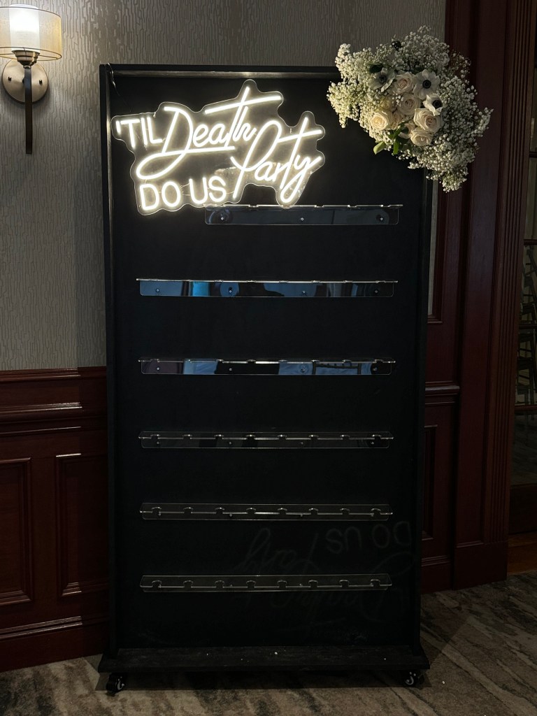 A black champagne wall with acrylic shelves holding up to 46 glasses. Add a neon sign up to 14 inches tall or request custom wording added with vinyl. Glasses are not included with this rental. Additional decor like balloons or flowers can be added to this wall at an additional cost.
